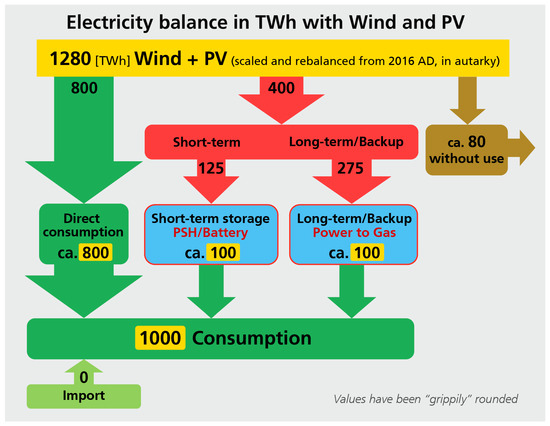 Typical yearly overall electricity flux scheme in Germany when the energy transition is completed and no imports are needed, ensuring autarky [10].