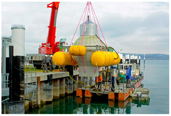A few days before the Fukushima event, several patents [42,43,44,45] for such a U.PSH energy storage device were submitted, by A. H. Slocum et al. [42] in the US and by the two authors H. Schmidt-Böcking and G. Luther [43,44,45] to the German Patent Office in Munich. Only a few weeks later (1 April 2011), the U.PSH storage idea on the floor of the ocean was published in the German newspaper “FAZ” by G. Küffner [54,55]. Based on that, a research proposal was submitted to the former German Federal Ministry of Economics (BMWi) by the Fraunhofer Institute for Energy Economics and Energy System Technology—IEE in Kassel and HOCHTIEF Solutions AG in Essen for building and testing a prototype of a U.PSH. The funded project named StEnSea (Storing Energy at Sea) tested a functional model in November 2016 (Figure 6) in Lake Constance [48,49].