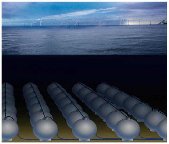 In Figure 9, an example of a SC-U.PSH, placed on the ocean floor, is shown, obtaining its renewable energy from floating wind turbines. The electric cables are indicated in red.