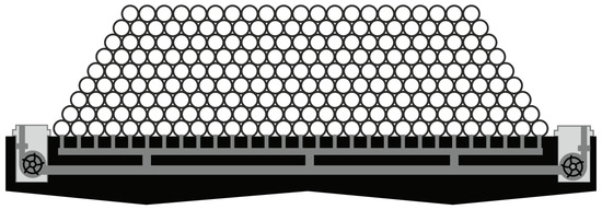 In deep water, a concrete-made storage carrier might be a preferable economic solution. The storage carrier U.PSH (SC-U.PSH) is manufactured in a dry dock on shore. The sub-construction of the carrier (black part in Figure 8) is made of concrete. It includes a piping system, which connects the two turbines (right and left in Figure 8) at both ends of the carrier with all empty small containers mounted on the sub-construction. The small containers may be pipes or spheres, depending on the structural analysis of the whole SC-U.PSH. The size of the carrier is chosen here so that the final water net storage volume is about 500,000 m3. When the container carrier is installed at a certain depth h (in m), the final electric energy storage capacity E is then