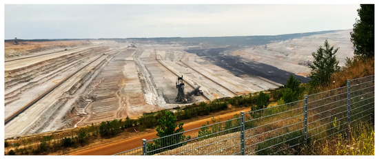 To construct an onshore U.PSH, one needs deep lakes, e.g., Lake Constance (maximum depth: 251 m), which is the only natural lake in Germany that is close to the required depth. However, to protect this unique valuable natural heritage, the people and consequently the political administration would never allow the installation of a U.PSH there. Fortunately, open mining pits could be used for U.PSH as well. These places are, e.g., open coal pits that are or will be shut down in the near future. These mining pits will be flooded when not in operation anymore. For example, the lignite mining pit in Hambach (located between Cologne and Aachen, Germany; see Figure 10) is 460 m deep and its deepest floor is about 1 km × 4 km in size. In 2030, the lignite harvesting there will end and the whole area will be converted into a recreation park. Installed at the bottom of the mining pit, the U.PSH would be invisible after flooding the pit. The operating U.PSH would only be noticed by lake level fluctuations (typically some meters in height).