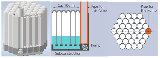Sketch of segment A. Left: the view from outside, middle: sectional view. The outer pipes have thicker walls to resist the high water pressure; the inner pipes form one storage volume and thus always have the same low pressure. At the bottom of one pipe (here, the one on the right), the turbine is mounted. This pipe provides the water in- and outlet. The wall of this pipe is thicker and prepared to resist the high inner water pressure. Right: Top view of segment A.