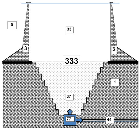 Figure 14. Lower storage basin 333, consisting of ring dam wall 3 and bottom storage hole 37, of a PSH operating in residual lake 0 of a former open cast mine. Storage hole 37 will be dredged out of the later lakebed 1 with the existing open cast mining machines (for more detail, see [10,47]).