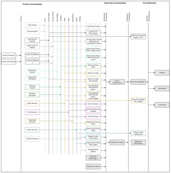 A fundamental element of an energy modelling framework is the reference energy system (RES), representing whole energy systems, including commodities and technologies, from primary energy resources to final energy demand (Figure 1). Ref. [] identified that an RES represents all existing and potential new technologies used in energy supply chains in a simplified graphical form. Additionally, the model incorporates the final energy requirements according to sector and exogenously supplied fuels.