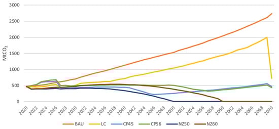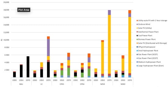 Undoubtedly, the BAU scenario will emit more CO2 than any other scenario over the modelling period (Figure 6). Consequently, it is expected to increase significantly. BAU consists only of fossil-based technologies that release much more carbon dioxide into the atmosphere. This scenario generates some renewable energy, but the capacity is too small to impact the energy mix significantly. In this study, the BAU scenario is chiefly considered a reference scenario, as it will not achieve an energy transition. In Figure 6 and Figure 7, the CO2 emissions in the LC scenario are less than in the BAU scenario but do not achieve carbon neutrality. Similarly, the leading electricity generators also come from CO2-emitting technologies. Although the model estimates that renewable energy will account for 70% of 2070, it saves only 30% of carbon emissions (Figure 8). Therefore, the LC scenario is not considered the best option for the energy transition. The sharp decline in the LC scenario is caused by the ending of the time frame and can be amended by shortening the ended year.