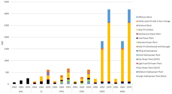 Installed capacity in different scenarios between 2020 to 2070.