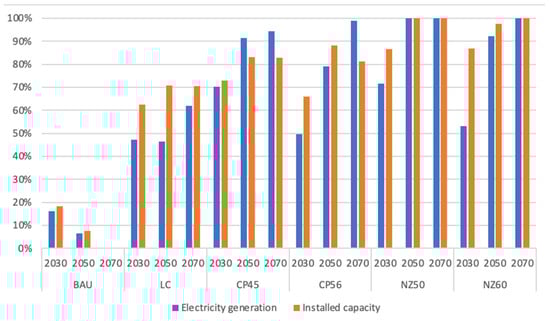 According to the results, renewable technologies account for a similar share of electricity production and installed capacity in both the NZ50 and NZ60 scenarios, forecasted to grow from around 80% in 2030 to 100% in the 2070 NZ50 and NZ60 scenarios (Figure 4). Solar power plays a vital role in both scenarios for supplying electricity and with regard to installed capacity, resulting in higher power generation and capacity. The NZ50 scenario invests in solar and onshore wind energy, with a small proportion of coal, natural, CCGT gas and SCGT gas remaining until 2050 (Figure 2 and Figure 3). By 2050, NZ50 will have 100% renewable energy in its energy mix. Similarly, solar PV (utility), and onshore wind dominate its energy mix in the NZ60 scenario, but coal, natural gas, CCGT gas, and SCGT gas capacity will remain a small portion until 2060. A possible reason for the outstanding installed capacity in the NZ scenarios (Figure 3) is that the main energy source, CCFPs, is hardly constrained throughout a timeframe. So, the models seek alternative energy sources, especially renewables such as solar power plants and offshore wind.