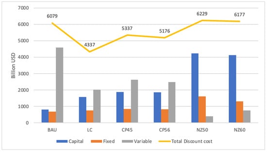 Figure 5 compares the discounted costs of six scenarios in a million USD from 2020 to 2070, separating the total costs into three categories: capital, fixed, and variable costs. This paper used a 10% discount rate, which is a typical value, to set a benchmark for considering risks in a future investment []. The electricity generation in the BAU scenarios heavily relies on coal. There are a few clean energy sources, while the CFPP investment is eight times higher than the investment in geothermal power plants. So, BAU has the highest variable cost relative to the other scenarios due to fuels from the high fossil-based activity and new investments. However, BAU also uses fewer new technologies, resulting in lower fixed and capital costs. The LC scenario is developed to find the cheapest pathway to meet future demand. With a cost of only 4300 billion USD, this represents the lowest energy expenditure for Indonesia to meet its energy needs. In this scenario, renewable energy has more room to grow, even though it costs 1700 billion USD less than BAU (Figure 5). Thus, deploying renewable power plants can reduce the investment needed in the energy sector.