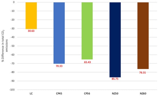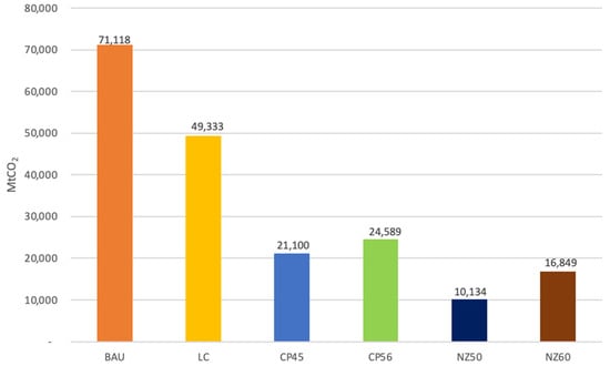 Alternatively, achieving the energy transition through net-zero scenarios is possible. This project focuses on achieving net zero by 2050 and 2060. The result illustrates that NZ50 releases the least carbon dioxide with only around 10,100 MtCO2 or 86% carbon savings compared to the BAU as renewable technologies dominate the energy mix (Figure 8). In the same way, the NZ60 scenario emits CO2 of only around 17,000 MtCO2, which is a 76% reduction over the BAU, second only to the NZ50 scenario (Figure 8). There is a significant difference between the NZ60 and NZ50 in CO2 emissions, although NZ60 has almost the same share of renewable shares as NZ50. One of the possible reasons is that a ten-year gap between 2050 and 2060 allows fossil-based power plants in the NZ60 scenario to generate an extra 2500 MtCO2 in the intervening years (Figure 7).