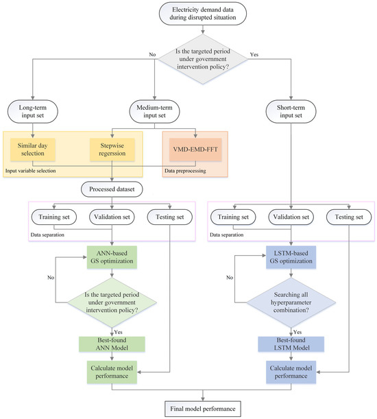 In order to solve the problem of input variable selection and data decomposition, a hybrid approach of VMD-EMD-FFT, SD, stepwise regression, and ANN was proposed and successfully enhanced the accuracy of forecasts and saved computational time [53]; however, there are limitations when applying this model to the pandemic year. Specifically, the model lacks the flexibility and adaptability needed to quickly adjust to sudden changes when disrupted events occur. These limitations stem from the model’s method of incorporating historical data, which overlooked the different characteristics of the short-term dataset (the most recent data during the pandemic year), medium-term dataset (the encompassing data from an intermediate time span), and long-term dataset (the data before the pandemic year). Consequently, a significant portion of the training dataset originated from the normal situation phase, which failed to accurately represent electricity demand during disruptions. Moreover, the model’s SD strategy, which selected similar days based on the demand of the pre-pandemic year, is impractical because the demand in the year before the disrupted event reflects a standard situation phase and does not capture demand dynamics during disruptions. Thus, these limitations confine the flexibility of the forecasting model, making it hard to capture the intricate electricity demand patterns during disrupted situations, leading to poor forecasting outcomes.
