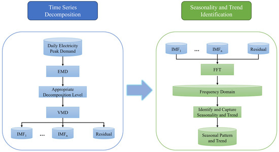 In the initial phase, the original electricity demand is contaminated with uncontrolled noise components, which can significantly impact the accuracy of forecasting due to inherent volatility and randomness [47]. In the disrupted situation, the daily changes in electricity demand cause a dramatic fluctuation from day to day, increasing the uncontrolled noise components and making it more challenging to identify seasonality and trends. To help the forecasting model capture the extreme patterns of electricity demand during the disrupted situation, data decomposition and seasonality identification methods are applied to the medium-term input set located in the disruption period, as shown in Figure 2.