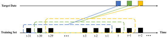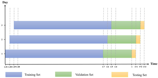 The disrupted situation introduces unique dynamics to daily electricity demand patterns, leading to continuous changes. To adapt to these patterns, a one-day-ahead forecasting approach [39] is applied for each target date in the testing dataset, as shown in Figure 3. Within this approach, forecasted target dates t, t + 1, and t + 2 are represented by blue, green, and yellow boxes, respectively. Each dotted box delineates the historical training set range for every forecasted target date, containing historical data up to the current or present dataset.