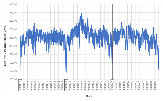 Daily electricity peak demand between 2018 and 2020.