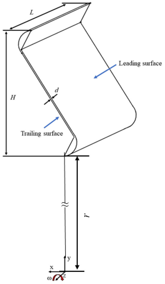 Figure 1a is an assembly physical map of the blade and turbine disk. The S-shaped mortise and tenon gap, marked by the red circle in Figure 1b, is at the connection between the turbine disk and the blade. Figure 1c shows the computational model used in the calculations, consisting of an inlet chamber, an outlet chamber, and the intermediate mortise and tenon gap channel. The parameters of the model are shown in Table 1. Figure 2 illustrates the locations of particular parameters. The leading and trailing surfaces in this paper refer to the left and right sides of the mortise and tenon channel, with the view direction being the outlet direction of the channel. Both of them are marked with blue arrows in Figure 2. The distance r between the model and the axis of rotation is 400 mm.