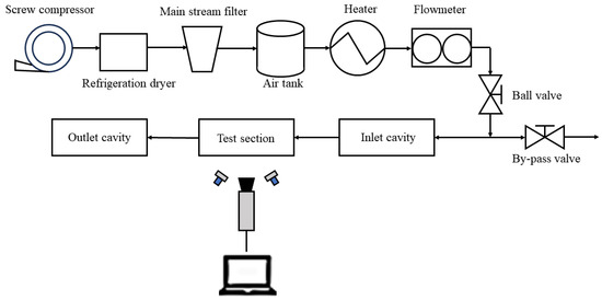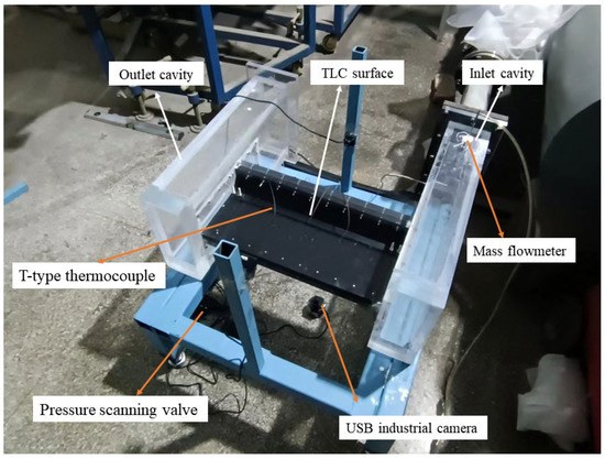 Experiments were carried out on a model of gas turbine blade mortise and tenon assembly gap. The experimental system diagram is shown in Figure 3, consisting of the main flow system, experimental section, and data acquisition system. The mainstream is supplied by a screw compressor (0.7 MPa, 0.4 kg/s), and the gas passes through a refrigerant dryer, a filter, a storage tank, a heater, a mass flowmeter, and then into the experimental section, which is constructed using assembled acrylic glass plates connected with bolts. The data acquisition system is responsible for collecting information on liquid crystal color changes, temperature variations, and pressure changes. The measuring instruments required in this paper include: pressure scanning valve, mass flowmeter, T-type thermocouple, USB industrial camera, and so on.