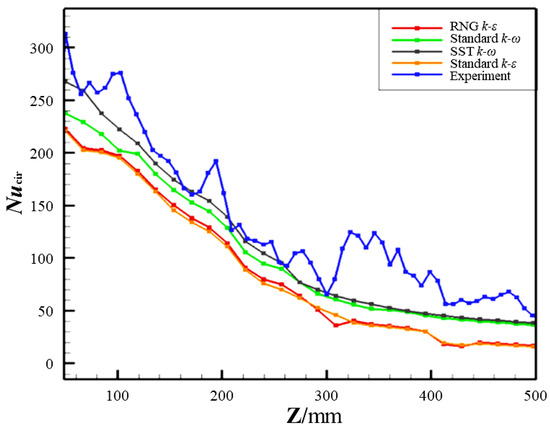 Figure 5 compares the distribution of Nucir along the flow direction between the numerical calculations and experimental measurements. The Z in Figure 5 refers to the Z-axis in the coordinate system, which is parallel to the flow direction. The SST k-ω turbulence model’s prediction of Nucir, as illustrated in Figure 5, exhibits the greatest agreement with the experimental results. Therefore, the SST k-ω turbulence model is chosen for all subsequent calculations.