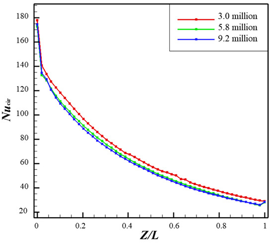 To ensure the accuracy of the computational results with minimum computational resources, three grids with 3 million, 5.8 million, and 9.2 million cells were selected for grid independence verification. Figure 6 shows the distribution of Nucir on the trailing surface for different grid numbers. It can be observed that when the grid number is larger than 5.8 million, Nucir remains almost unchanged. Considering the grid quantity, computational accuracy, and computational time, the grid number of 5.8 million was determined for this study.