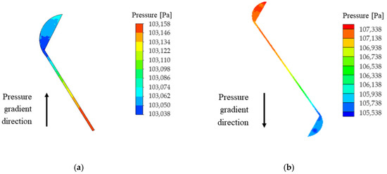 Figure 7 shows the pressure distribution at Z/L = 0.5 under static and rotating conditions. The black arrow represents the direction of the pressure difference. It can be observed that under the rotating condition, the pressure distribution is different from that in the static condition. The pressure increases in the radial direction due to the centrifugal force, reaching its maximum value at the corner of the S-shaped mortise and tenon structure.