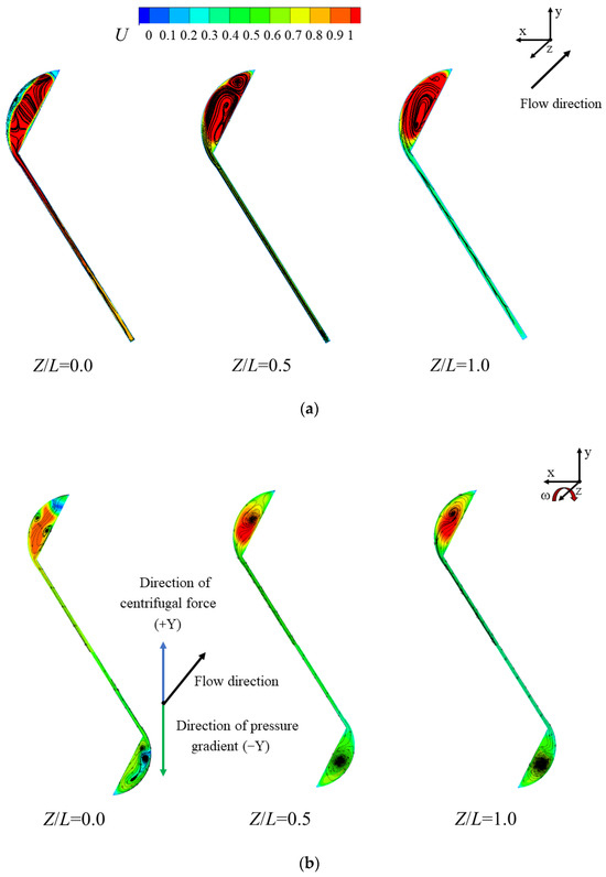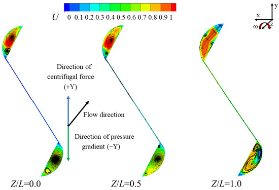 Figure 13 shows the dimensionless velocity contours and flow streamline distributions at Z/L = 0.0 (near inlet), Z/L = 0.5 (middle of the channel), and Z/L = 1.0 (near outlet) of the mortise and tenon gap under rotating conditions with a gap width of d = 0.2 mm. Additionally, the results in the same positions and conditions with a gap width of d = 0.6 mm have been shown in Figure 8b. The black arrows represent the flow direction of the S-shaped channel, the blue arrows represent the direction of the centrifugal force, and the green arrows represent the direction of the pressure gradience. The direction of rotation has been labeled in the figure. As can be seen in Figure 8 and Figure 13, the flow pattern with different gap sizes is almost the same. The only difference is the velocity magnitude in the lower crescent corner of the narrower gap is larger, while the velocity magnitude in the straight slot of the narrower gap is lower, especially at the inlet portion. One reason for that is the air velocity decreases with the gap width expands since all cases are kept consistent in Re, and the hydraulic diameter of the gap increases with the gap width. Another reason for that is the effect of the wall on the flow will be more notable in a narrower slot.