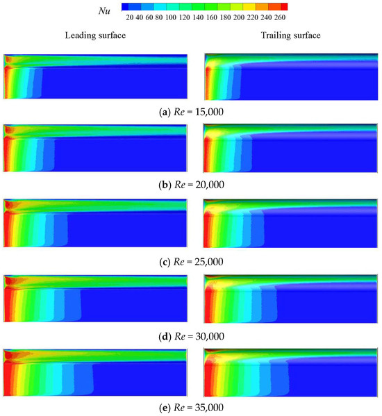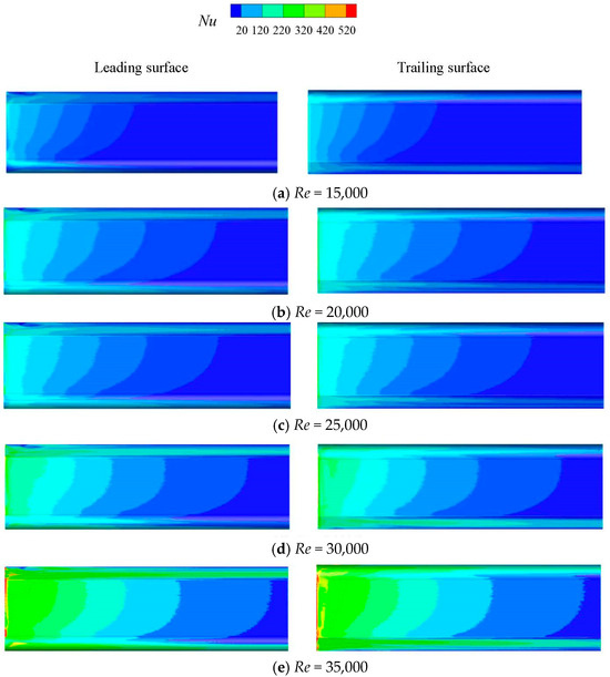 Figure 10 and Figure 11 illustrate the Nu distribution contours on the leading and trailing surfaces of the mortise and tenon gap under static and rotating conditions for different Res, respectively. As illustrated in Figure 8, the rotating effect encouraged the formation of a vortex within the channel, resulting in an increase in turbulence within the entire gap (Figure 9), as well as an improvement in the heat exchange between the gap wall and cooling air. Local Nu is larger at the channel inlet under the rotating condition than in the static condition because the fluid is subjected to higher intensity consumption vortices and turbulence at the inlet. At the same time, the presence of vortices within the larger space (upper and lower corner) of the mortise and tenon gap enhances the local heat transfer. Meanwhile, Nu in the middle narrow slot part of the channel is reduced because the advantageous vortices produced in both the static and rotating conditions are smaller. At the outlet of the channel, the size and number of vortices generated under static and rotating conditions are both reduced. As a result, Nu is gradually reduced along the axial direction, consistent with the analysis results in Figure 8. Under rotating conditions, the magnitude of channel vortices in the top half of the channel is larger than that in the lower half due to the effect of centrifugal force. Thus, the heat transfer in the upper half of the channel is larger.