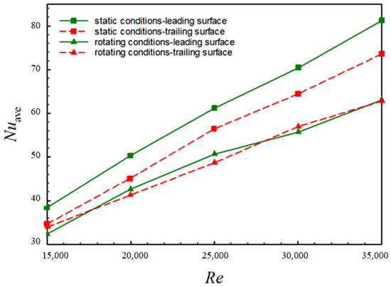 The globally averaged Nu (Nuave) distributions of the leading and trailing surfaces under static and rotating conditions for different Res are given in Figure 12. The Nuave is defined as: