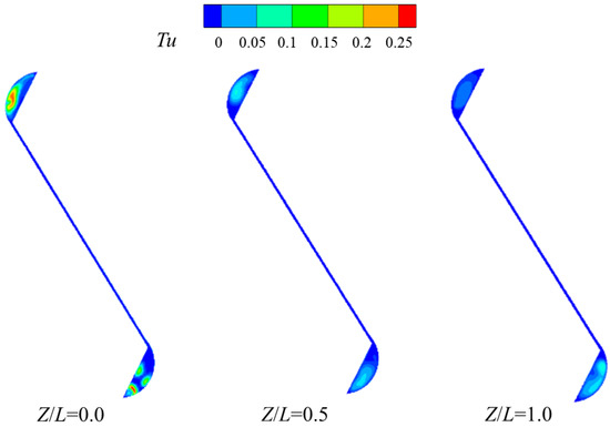 Figure 14 demonstrates the fluid turbulence intensity contours of the mortise and tenon gap at Z/L = 0.0 (near the inlet), Z/L = 0.5 (middle part of the channel), and Z/L = 1.0 (near the outlet) with a gap width values, 0.5. Additionally, the turbulence intensity in the same positions and conditions with a gap width of d = 0.6 mm is shown in Figure 9b. It can be seen that the variation of turbulent intensity within the structure channel follows the same pattern as analyzed in Figure 9. Meanwhile, the magnitude of the turbulence intensity increases with the gap width.