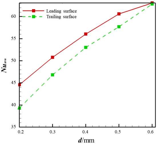 Figure 16 shows the distribution of Nuave on the leading and trailing surfaces for different mortise and tenon assembly gap widths under rotating conditions. From the figure, it can be seen that the channel Nuave increases with the increase in the mortise and tenon assembly gap width. In the rotating condition, the vortex size of the channel near the leading surface is slightly larger than that of the trailing surface. Therefore, the heat transfer between the fluid and the leading surface is slightly stronger than compared to the trailing surface, but the difference between them is not significant. It is consistent with the analysis results in Figure 13. Consistent with Figure 15, as the channel gap width reduces, the channel Nuave falls, and the Nuave difference between the leading and trailing surfaces increases.