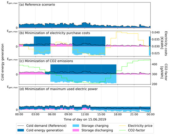 Optimized operation of the cold warehouse for (a) reference scenario, (b) minimization of electricity costs, (c) minimization of CO2 emissions, and (d) minimization of maximum used electric power on 15 June 2019.