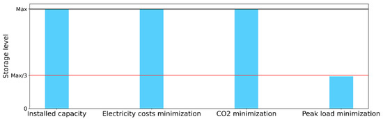 It can be inferred from the optimized operation of the cold warehouse depicted in Figure 3 that the storage was filled to a larger extent for the goals “minimization of electricity costs” and “minimization of CO2 emissions” compared to the goal “minimization of maximum used electric power”. The maximum level of stored cold energy for the three studied goals can be seen in Figure 4 in comparison to the installed capacity of the storage.