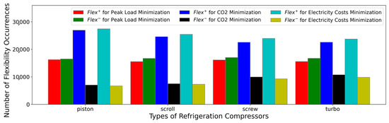 As the solver only tried to minimize the operational costs based on the corresponding objective function and penalty costs, it could happen that the number of occurrences of positive and negative flexibility were different for different goals during operation. Figure 5 depicts the number of intervals with positive and negative flexibility for the three optimization goals and the four compressors. As can be seen, the number of intervals with negative flexibility was slightly higher than that of those with positive flexibility for peak load minimization, whereas intervals with positive flexibility occurred much more frequently than intervals with negative flexibility for the other two goals. This means that charging and discharging cold energy into and from the cold energy storage was evenly distributed throughout the operational period for the goal “minimization of maximum used electric power”, while shorter periods of excess cold generation followed by longer periods of discharged cold energy occurred for the other two goals. This can be explained by the fact that a large installed cold energy generation capacity and a large storage provided the opportunity to generate and store a high amount of excess cold energy over a short period to meet the demand over a longer period for these two goals. The results shown in Figure 5 can be confirmed by parts (a) to (c) of Figure 3 to some extent as well.