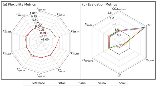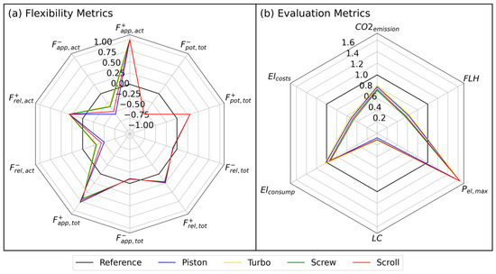 Potential flexibility, to begin with, showed slightly higher negative than positive values, as can be seen in Figure 6, Figure 7 and Figure 8, meaning that the cold warehouse theoretically had more potential to store excess energy than to meet the demand by discharging energy from the storage. This slight difference can be attributed to the fact that the installed capacity of the cold supply system of the cold warehouse was assumed to be 1.5 times bigger than its maximum cold energy demand and a large highly efficient storage was considered for the model. It is worth stating that potential flexibility was the same for all three goals and refrigeration compressors, as it was goal-independent, and same-sized compressors were considered. When it comes to applied flexibility, Figure 6 shows that the actual positive applied flexibility nearly reached its maximum value (+1) for all compressors for the goal “minimization of electricity costs”, meaning that the cold energy demand was almost entirely met by the storage whenever positive flexibility occurred. Actual negative applied flexibility, however, showed values between for piston compressor and for turbo compressor, meaning that only a part of the excess energy generation capacity was used to fill the storage in the periods where negative flexibility occurred. Both these patterns can also be observed in Figure 3. A similar pattern could be observed for actual positive and negative relative flexibility, only with smaller values, which were due to the fact that relative flexibility compared the deviations in the operation mode of the energy system in a single interval to the maximum possible deviations in an interval during the entire period, whereas applied flexibility compared the deviations in an interval to the maximum possible deviation in the same interval, resulting in smaller values for relative flexibility. When it comes to total flexibility, positive applied flexibility still showed a high value (around ), while negative applied flexibility showed a much smaller absolute value (around ), meaning that the occurrences of the intervals with positive flexibility were much higher for those with negative flexibility, as it was also observed in Figure 5. This can be understood from the fact that total flexibility metrics were calculated by dividing the sum of the corresponding metrics to the number of all intervals, meaning the metric with a higher number of occurrences would have a higher aggregate value and therefore a higher total flexibility. Total relative flexibility showed a similar pattern to total applied flexibility for both positive and negative flexibility only with smaller values, which can be explained by the same logic as for actual flexibility. In terms of evaluation metrics, it can be observed in Figure 6 that electricity costs, whose minimization was the goal of the corresponding scenarios, decreased drastically by nearly 50%, with screw and turbo compressors as the most cost-efficient refrigeration compressor types. A reduction of between 20% and 25% could be observed for CO2 emissions, which can be explained by the merit-order effect resulting in lower electricity prices in periods of higher electricity input to the German electricity grid from wind and solar energy [50]. Electricity consumption, however, did not increase considerably in spite of the staggering reductions in the electricity costs and CO2 emissions, which was the result of the optimal usage of the compressors to generate excess energy at their highest efficiency and also the assumption of a very efficient cold energy storage. The maximum used electric power was nearly equal to the maximum installed electric power of the compressors, implying that the compressors were put into service with full capacity at least once during the entire period to generate excess energy. A similar electricity consumption to the reference scenario, together with a much higher maximum used electric power, resulted in much lower full load hours in the optimized operations for this goal. To sum up, it can be said that the corresponding initial goal, which was to minimize electricity costs, was fulfilled not only to a very promising degree but also with side advantages, such as much lower CO2 emissions with almost the same amount of energy consumption. Load change, as the last evaluation metric, declined drastically, as the compressors were used at their most efficient partial load efficiency most of the time, resulting in a much less frequent change in their operational mode, as could also be seen in Figure 3b.