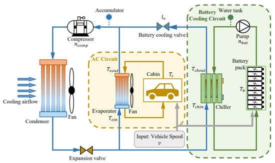The proposed EVTMS in this study, including a battery cooling circuit and an air-conditioning (AC) circuit, is illustrated in Figure 1. It mainly consists of a compressor, expansion valve, condenser, chiller, battery pack, cabin model, pump, water tank, accumulator, fan, and battery cooling valve. The whole TMS is built based on the commercial software GT-Suite, and the specific parameters of each component are obtained by investigation or the reference value in GT-Suite Library, which is further obtained through test bench and thus can represent the components in real world effectively. Some information about the key components is given below.