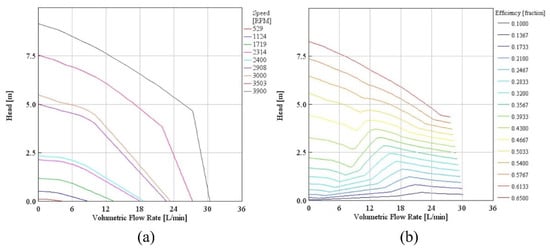 Contours of head, volumetric flow rate and pump parameters (a) speed; (b) efficiency.