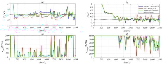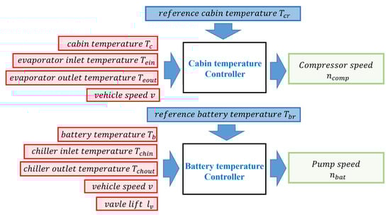 The input–output diagram of the control system is shown in Figure 6. Considering the economic and safety factors, the reference battery temperature is set to 35 and the reference cabin temperature is set to the in Equation (19). The manipulated variables are the pump speed and the compressor speed . The main input variables include battery pack temperature , cabin temperature , vehicle speed , evaporator inlet and outlet temperatures , chiller inlet and outlet temperatures , and battery cooling valve lift . The range of the manipulated variables is set as follows: