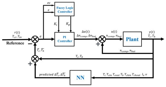The electric vehicle thermal management system (EVTMS) plays a crucial role in ensuring battery efficiency, driving range, and passenger comfort. However, EVTMSs still face unresolved challenges, such as accurate modeling, compensating for temperature variations, and achieving efficient control strategies. Addressing these issues is crucial for enhancing the performance, reliability, and energy efficiency of electric vehicles. Therefore, this study presents a cooling EVTMS model, considering both the battery pack temperature and the cabin comfort, and utilizes the prediction of neural network as a feedforward in a fuzzy PI controller to compensate for the model temperature variations. The simulation results reveal that, compared with PI controller and MPC, the neural network fuzzy PI (NN-Fuzzy PI) controller can well predict and compensate for the system’s nonlinear characteristics as well as the time-delay caused by heat transfer, achieving superior control performance and reducing energy consumption. The battery pack temperature and fluctuations are effectively constrained within [−0.5, 0.5] and [−0.1, 0.1], reducing up to 150% and 164%, and the energy consumption of the pump and compressor are reduced by up to 0.23 and 100.1 , with ranges of 18% and 2.68%. Meanwhile, the neural network feedforward also works effectively in different controllers. The findings of this research can provide valuable insights for TMS engineers to select advanced control strategies.