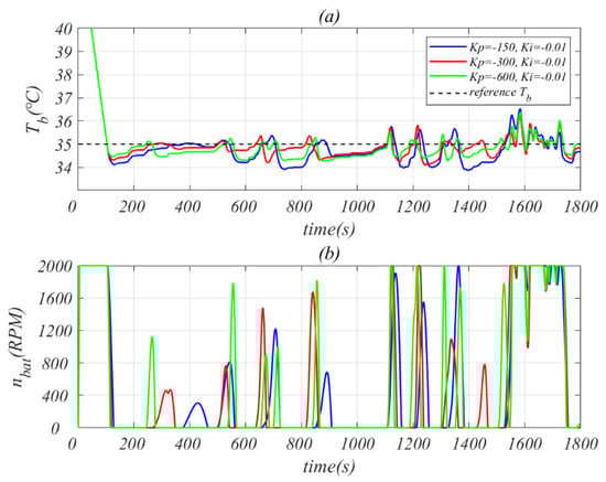 The advantage of proportional (P) controller is timely and rapid, but it will produce residual errors, while the integral (I) controller can eliminate residual errors, but it is not timely. Therefore, this study adds I controller on the basis of P controller to form an incremental parallel PI controller, as shown in Figure 7. However, it should be noted that in this work, two similar PI controllers are used separately, where the first is used for controlling the battery temperature, and the second is used for controlling cabin comfort. The controlled values are the increment of and and the control inputs are the deviations of and from the reference value , , respectively. The control principle is Equations (35)–(37), where are proportional coefficient and integral coefficient.
