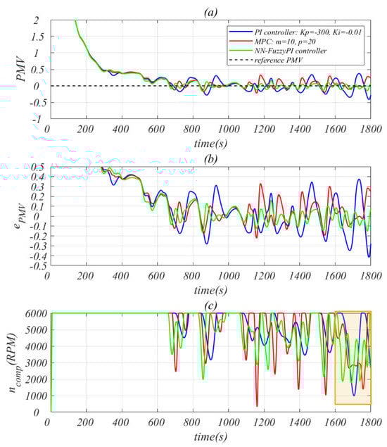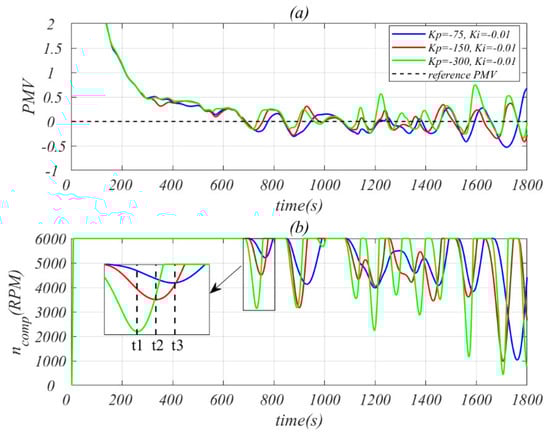 According to references [39,40,41,42], the cabin air temperature is considered to be the sole variable in this study. Thus, the driver’s is set at 1 ; is set at 0.5 during summer; is set to 0. The fan speed in the cabin remains constant at 2400 , resulting in an approximate of 0.2 . is maintained at a constant value of . Since measuring the average is challenging, it is assumed to be equal to . Based on Equations (11)–(18), when is equal to zero, the driver experiences the highest comfort level, the corresponding comfortable temperature can be determined using Equation (19), which is also used as the reference cabin temperature for the AC circuit controller.