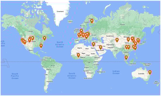 Figure 1. Referenced geographical locations for PV power plants in analysed literature that cover various types of climate: Europe—16 references, USA—15 references, China—8 references, created using Google My Maps (https://www.google.com/mymaps) on 12 September 2023.