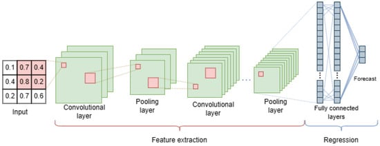 A Convolutional Neural Network (CNN), also referred to as ConvNet [] in text, is a specialized deep learning architecture for processing grid-like data, such as images and spatial or tabular data. Unlike traditional NNs, CNNs excel at capturing localized patterns and spatial hierarchies within the input data. They are composed of convolutional layers that apply trainable filters to the input, producing feature maps that highlight relevant features. They typically produce outputs using fully connected (dense) layers after relevant feature extraction has been performed by convolutional and pooling layers, shown in Figure 2. CNNs can be highly effective for solar forecasting purposes. For example, Simeunović et al. in [] use a Graph CNN for forecasting the production of multiple PV power plants, where each plant represents a node of the graph. This type of CNN can effectively model spatial and temporal dependencies between different PV power plants, identifying common patterns across different locations through these dependencies. The authors suggest this method when forecasting production for multiple PV power plants that have spatial dependencies between them.