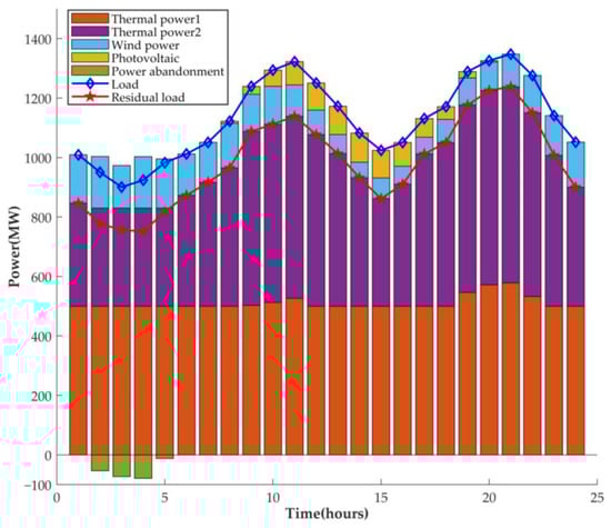 In scenario 1, although the renewable energy output has certain complementary characteristics on the intra-day scale, the net load of the system fluctuates greatly due to the large load peak-to-valley difference in this area, which makes the output adjustment of the second thermal power unit frequent. Simultaneously, the wind power output is large, and the system load demand is low in the early morning period. In order to meet the lower limit constraint of the thermal power units’ output, there will be a certain wind abandonment phenomenon during this period, resulting in an increase in system operation cost. Figure 5 shows the operating results of the system in scenario 1, where the abandoned power of the system is represented by the negative number.