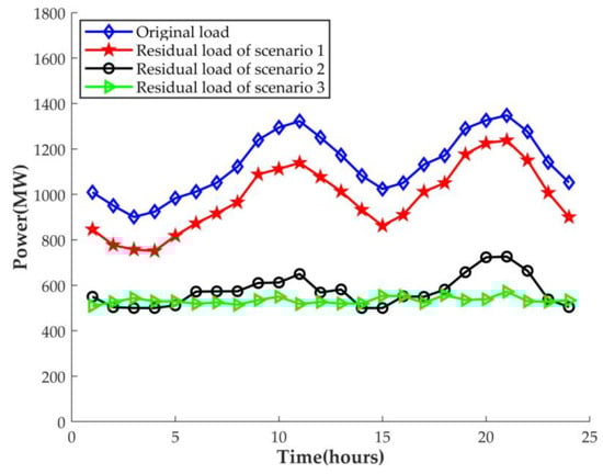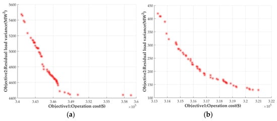 Figure 6 shows the Pareto optimal fronts obtained by the optimization model under scenario 2 and scenario 3, respectively. From the distribution of the solution sets, it can be seen that there is a certain contradiction between the two objectives, and the two objective function values of scenario 3 are better than those of scenario 2. It shows that the addition of the pumped storage power station can reduce the operation cost and further decrease the residual load fluctuation in the system, thus reducing the peak regulation pressure of thermal power units.