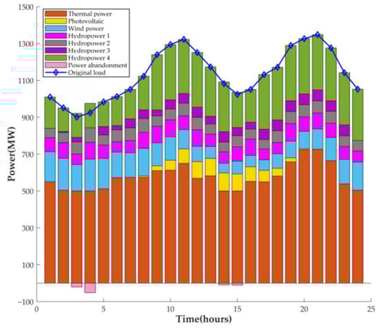 When the sum of the renewable energy predicts the output, the cascade hydropower regulation output and the lower limit of thermal power output in the hybrid system is greater than the predicted value of grid load, that is, the renewable energy output cannot be fully absorbed during the period. In order to ensure the stability of the system, the phenomenon of abandoning wind power and photovoltaic occurs.