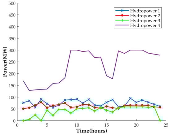 The output curves of four hydropower stations in this dispatching period are shown in Figure 8. From the optimization results, it can be seen that the output curves of h4 with the largest installed capacity follow the daily load variation trend of the system and play a major role in peak regulation. The low output of h3 in the early morning period and at the end of the dispatching period also plays a certain regulatory role. However, the inflow of h1 and h2 located upstream are all natural incoming water, and the output curves are relatively stable to ensure the reservoir dispatching plan within a day.