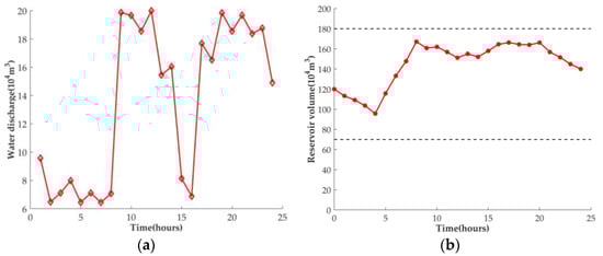 Variation curve of daily discharge and reservoir volume of h4. (a) Water discharge. (b) Reservoir volume. The diamonds and the dots represent the water discharge and the reservoir volume of the t period respectively. The red line shows the curve of water discharge and reservoir volume. The black dashed line in Figure 9b refers to the upper and lower limits of the reservoir volume.