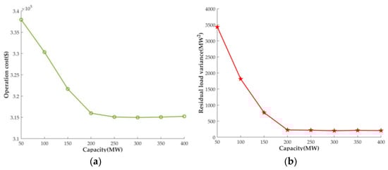 Pumped storage power plants with varying planning capacities have different optimal operating effects, and the costs of power plant development and maintenance are correlated with the required capacity. Therefore, the ideal configuration of the pumped storage power station with the lowest capacity is investigated. Figure 13 shows the operation cost and residual load variances under the varying configuration capacity of the PSH connected to the hybrid system.