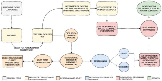 The phases of this research are articulated in a nonlinear way to define scientifically based solutions that complement the actions currently in place (Figure 2). The resulting reflections aim to harmonize and expand the beneficial effects of community initiatives. The creation of a repository of existing and planned RECSs in Italy, selected from those with more pronounced characteristics of social commitment and public involvement, is preparatory to the identification of economic and social indicators describing their potential, strengths, and weaknesses. To fully understand the organizational, administrative, and energy aspects of RECS, a multi-methodological survey is underway.