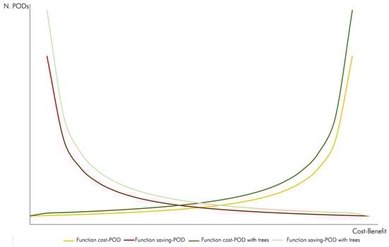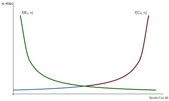 The graphical representation of Equations (14) and (15), in which the x-axis shows the values of costs and revenues and the y-axis shows the numbers of PODs, defines a parabolic symmetrical diagram (Figure 3). The f(; n) represents an increasing parabolic function with a vertical asymptote, which defines the number of PODs as the cost increases. On the other hand, f(; n) represents a decreasing parabolic function that defines the number of PODs as the economic savings in the bill increase.