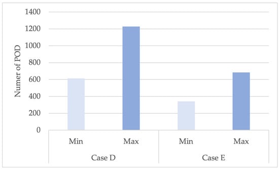 The first part of the analysis phase on the two pilot case studies as a comparison sample (D and E) enables an estimation of the number of PODs served by the REC through (14) and (15), according to an energy–cost balance. Subsequent calculation of indicators (16), (17), and (18) allows verification of PODs suitable to meet the economic and energy needs of the renewable community. The study focuses on the minimum and maximum eligible perimeters. The former defines a REC capable of feeding surplus energy to the power grid as well as ideally meeting the total renewable energy needs of the community. The latter harnesses almost all the energy produced for the community while feeding a negligible portion of it into the grid (Figure 5 and Figure 6). Different REC configurations were bordered through the GIS application, starting from the primary substations to which the hubs belong.