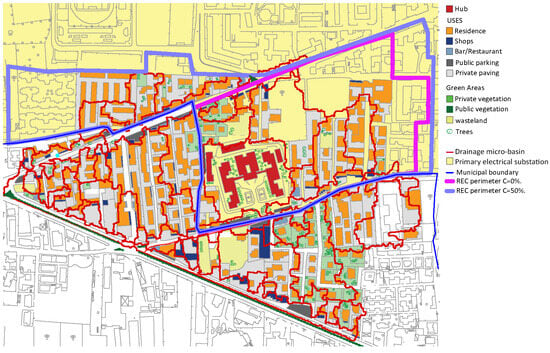 The subsequent identification of the runoff basins according to the trends of the outflow lines defines two different configurations. In case E, the local catchment area, given by the sum of the sub-basins, coincides with the perimeter of the REC, defining an ideal condition. In case D, the results are only partially coincident with the community.
