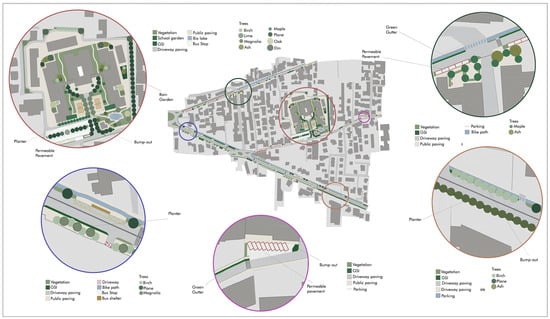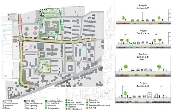 Simultaneous microclimatic, vegetation, and hydraulic analyses enable design interventions to improve thermal comfort by impacting the energy performance of buildings. Interventions include tree planting, the replacement of road pavements to reduce albedo, and the installation of Green Stormwater Infrastructures (GSI). In the verification phase, microclimatic, vegetation, and water management performance indicators allow comparison of the energy and environmental performance of the assumed technological solutions and the selection of the most suitable ones. Results are reported in Files S1 and S2 in the Supplementary Materials.
